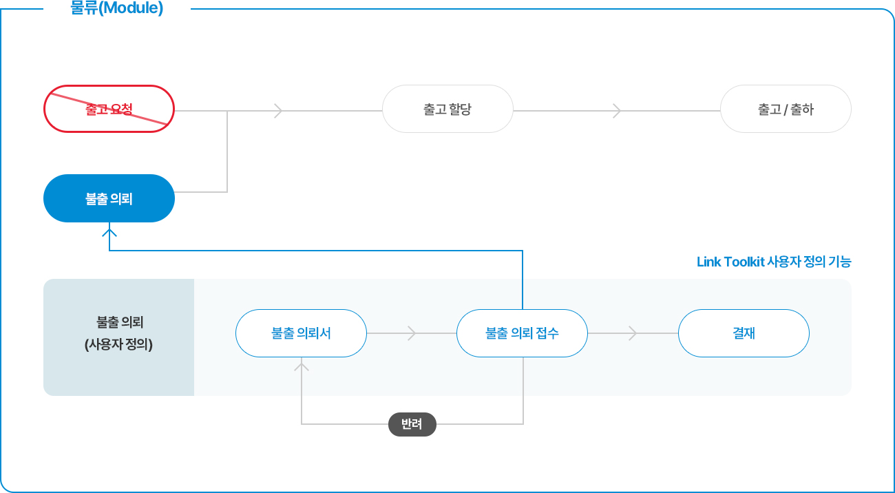 물류 모듈의 기본 기능인 출고 요청, 출고 할당, 출고/출하 기능 프로세스에서 출고 요청 업무를 제외하고, 불출 의뢰 업무를 Toolkit으로 만들어 물류 모듈에 붙여서 회사에 맞도록 수정하여 사용하는 예시입니다. Toolkit을 활용하여 단독 기능 및 메뉴로도 활용 가능하며, 위와 같이 기 기능에 연결하여 사용 가능합니다.