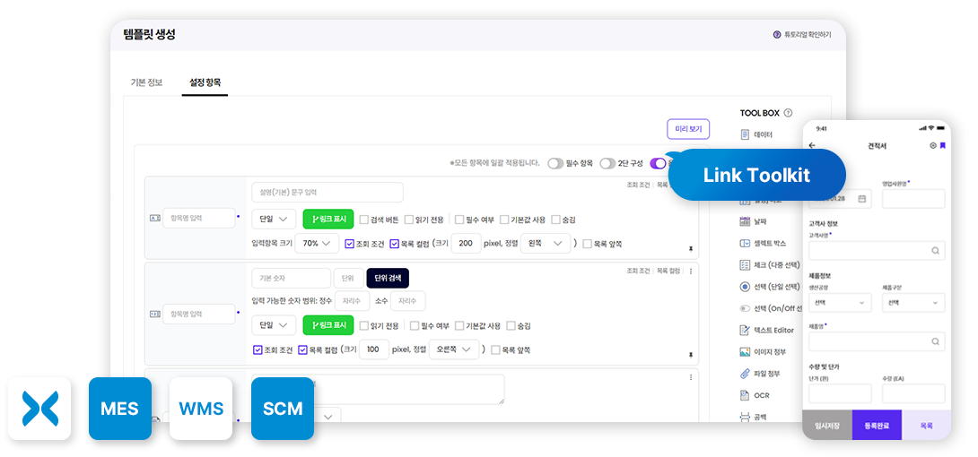 Link Toolkit은 MY-LINK만의 독자적인 기술로 개발한 업무 서비스를 시스템으로 만드는 Tool 입니다. 빠르고 편리하게 시스템을 만드는 기술로 다양한 제조 서비스를 만들고 있으며, 2025년까지 산업, 업무별로 200개의 업무를 서비스할 예정입니다.