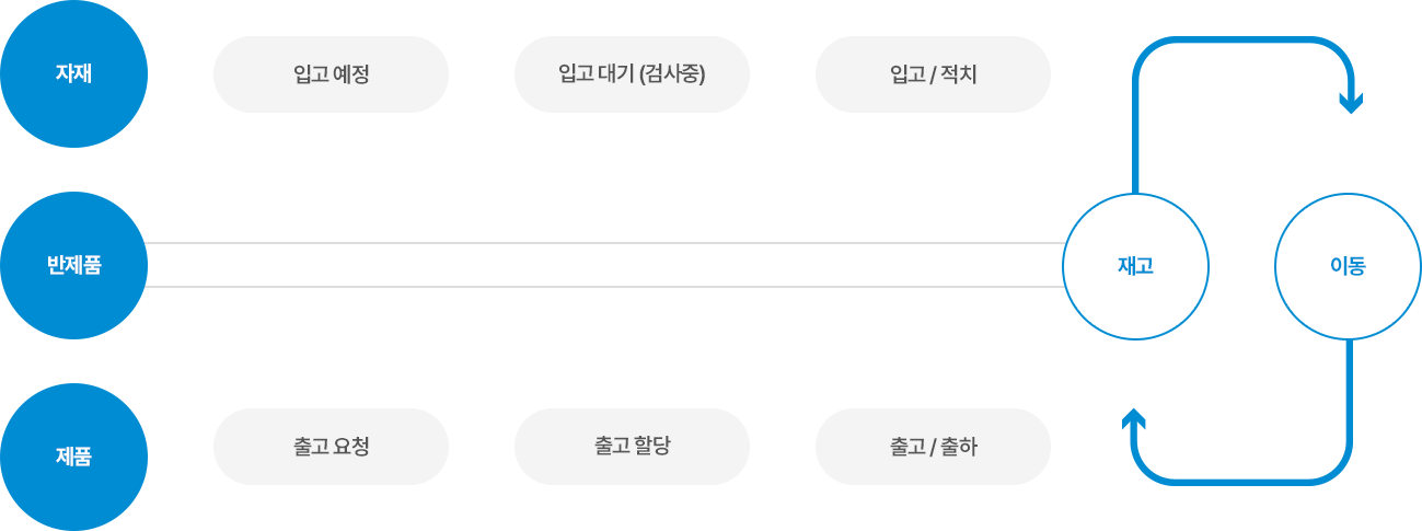수입 검사 ,출하 검사, 자재/제품 반품, 유수명 관리, 보류, 자동 선입/선출 관리, Pallet 관리, BOX 관리, 재포장, 폐기, 바코드 관리, 임가공, MES 및 3PL Interface